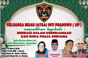 Keluarga Besar Satgas Inti Prabowo (SIP) Provinsi Sumatera Utara (Sumut) menggelar kegiatan berbagi takjil gratis sekaligus buka puasa bersama dalam rangka menyemarakkan bulan suci Ramadhan 1447 Hijriah.
