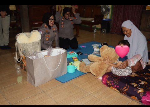 Sang anak tampak memeluk boneka pemberian Kapolres, seolah menemukan teman baru yang menenangkan di tengah trauma yang dialaminya.